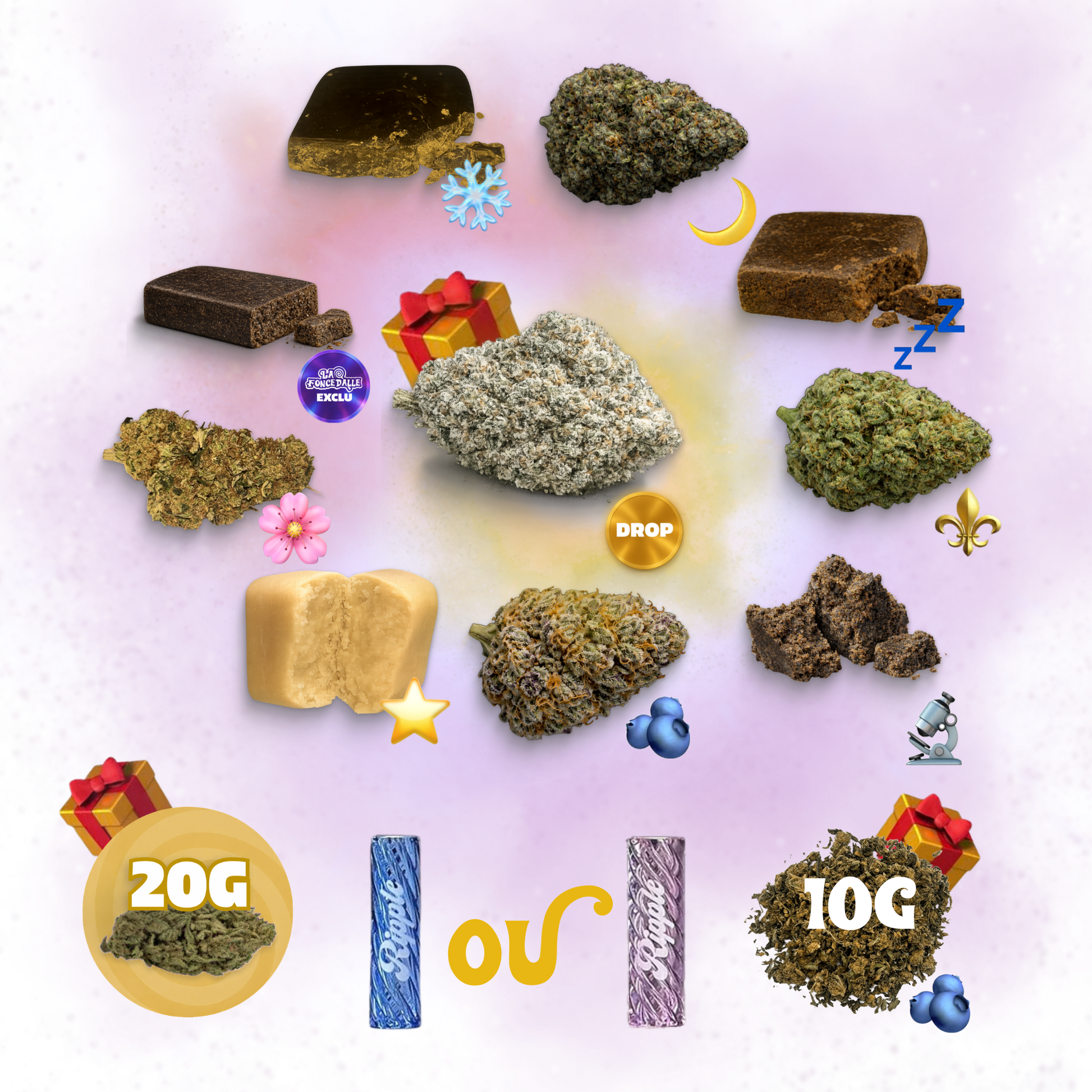 Cette box limitée contient nos meilleures sélections de fleurs et hash premium : Drop 🎁 : 💎 1G Dark Saphyr (Valeur 14€/g) Hash Exclusif ⏳ : Lemon Cherry Cola 1G (valeur 20€/g) Hash Premium ⭐️Melon Mimoza 1G (valeur 20€/g) 💤 Charras 1G (valeur 10€/g) ❄️ Lamponi Frozen 1G (valeur 13€/g) 🔬 Melt (valeur 9€/g) Fleurs Premium ⚜️ Golden Diesel 1G (valeur 10€/g) 🫐 Royal Berry 1G (valeur 10€/g) 🌸 Violline Cake 1G (valeur 12€/g) 🌙 Dream Skunk 1G (valeur 12€/g) Bonus 🎁 Filtre Gustatif Bleu ou Rose, pour expérimenter le CBD Gustatif comme il se doit d'être dégusté 10G Trim